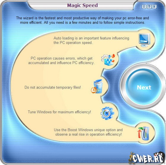 Magic Speed - программа для оптимизации работы операционной системы и очистки её от ненужных данных. В ней присутствуют средства для поиска и исправления ошибок в реестре Windows, проведения очистки системы от скопившихся временных файлов и включения некоторых опций операционной системы, повышающих её быстродействие. Magic Speed может анализировать автоматически запускаемые приложения, позволяя отключать загрузку неиспользуемых программ, а встроенный антивирусный движок поможет выявить среди них шпионские модули и другие вредоносные процессы. Кроме того, здесь имеются инструменты для дефрагментации оперативной памяти и ускорения загрузки системы. Для работы с приложением не требуется глубоких знаний ПК, все действия осуществляются с помощью пошагового Мастера оптимизации, все что от вас требуется, это 5 кликов мышкой.