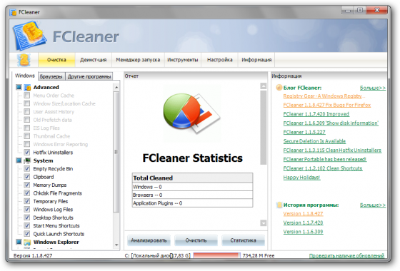 FCleaner чистит жесткий диск от всех ненужных файлов и освобождает драгоценное пространство. Программа находит временные файлы, списки недавних документов, автозаполнения, файлы в Корзине и другие данные. Пользователь самостоятельно выбирает, какую информацию удалить. Помимо очистки диска в утилите есть менеджер автозагрузки и инструмент для деинсталляции приложений. В статистике отображается объем освобожденного места.