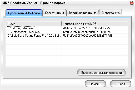 - небольшая программа для проверки MD5 и SHA1 хеша файлов. Позволяет пользователю проверять хеш-суммы файлов за пару кликов. Предусмотрена проверка в пакетном режиме. Результат можно отобразить на экране или экспортировать в XML-файл.