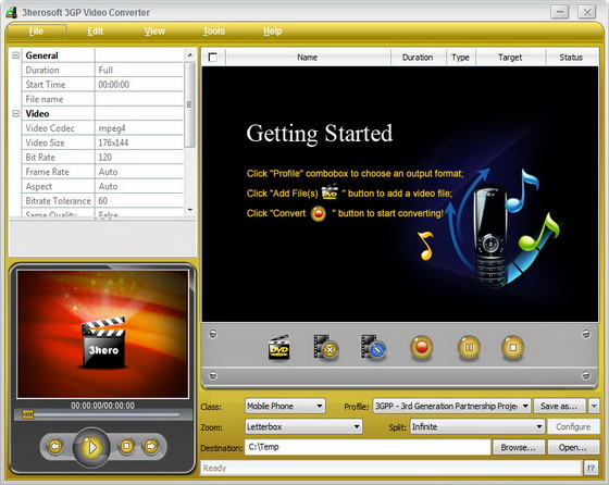 3herosoft 3GP Video Converter - конвертер большинства популярных аудио и видео форматов в форматы для мобильных телефонов. В программе предусмотрена поддержка Nokia, Motorola, BlackBerry, Sony Ericsson, Samsung и других телефонов. Позволяет конвертировать видео в 3GP, 3GPP2, MPEG1/2/4, WAV, Xvid, RM и другие форматы.