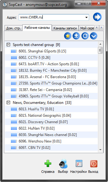 SopCast - утилита для просмотра видеотрансляций через интернет. Скачав ее на cwer.ws, вы сможете просматривать кинофильмы, прямые спортивные состязания, музыку, познавательные или развлекательные каналы и многое другое. Особенностью программы является то, что она работает через P2P сеть, позволяя при этом зарегистрированным пользователям транслировать свои собственные каналы.