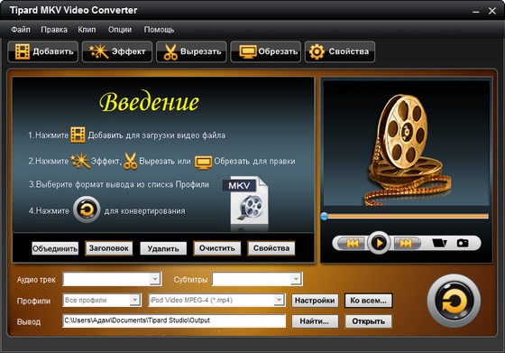 Tipard MKV Video Converter - конвертер MKV видео в другие популярные видео форматы, поддержка MKV, AVI, WMV, MPG, MKV конвертирования в AVI, MP4, WMV, FLV, 3GP, 3G2, MOV, MPG и другие форматы, извлечение аудио из видео файлов в MP3, AAC, M4A, WMA, WAV, AC3, OGG форматы, поддержка iPod, iPhone, Zune, PSP, PS3, Xbox и других, пакетный режим конвертирования, настройка параметров сохранения и конвертирования, предварительный просмотр и т.д.