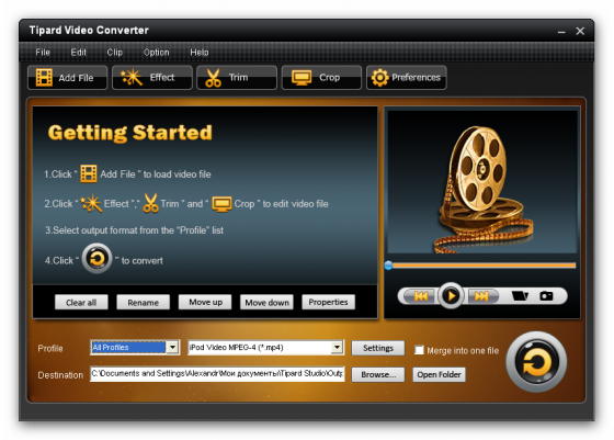 Tipard Video Converter - профессиональный конвертер видео файлов: MPG, MPEG, MPEG2, VOB, MOD, MP4, H.264, AVI, WMV и др. Также он может извлекать аудио из видео и конвертировать его в M4A, MP3, AC3, AAC, WMA, WAV, OGG. Конвертированные файы могут использоваться на портативных плеерах PSP, iPhone (3G), iPhone, Zune, Zune 2, Blackberry, Creative Zen, Sony Walkman, iRiver PMP, Archos, PS3, Apple TV, Xbox, iPAQ, Pocket PC, Mobile Phone и др.