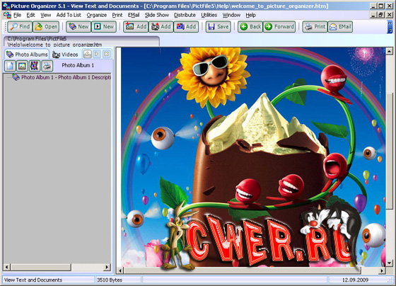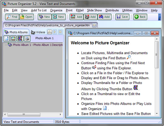 Picture Organizer - программа для поиска, редактирования и вывода на печать графических изображений и не только. Вы также можете работать с файлами мультимедиа, упорядочивая свою MP3-коллекцию. Также программа позволяет создавать слайд-шоу, сопровождая его многочисленными эффектами перехода и фоновой музыкой в форматах WAVE, MIDI или MP3. Функции редактирования изображений включают вставку участков одного изображения в другое, добавление текста, выбор цветовой палитры и т.д.